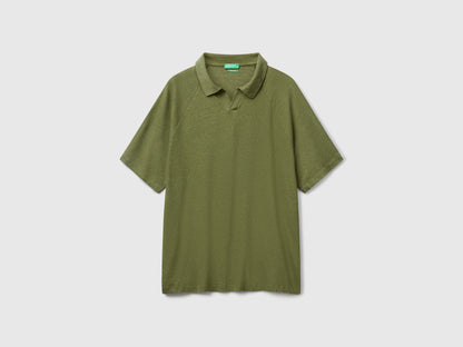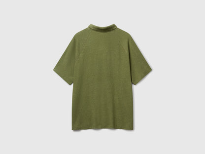 Polo in lightweight linen and cotton blend fabric. Shirt collar, V-neck and short raglan sleeves. Perfect for contemporary casual looks.