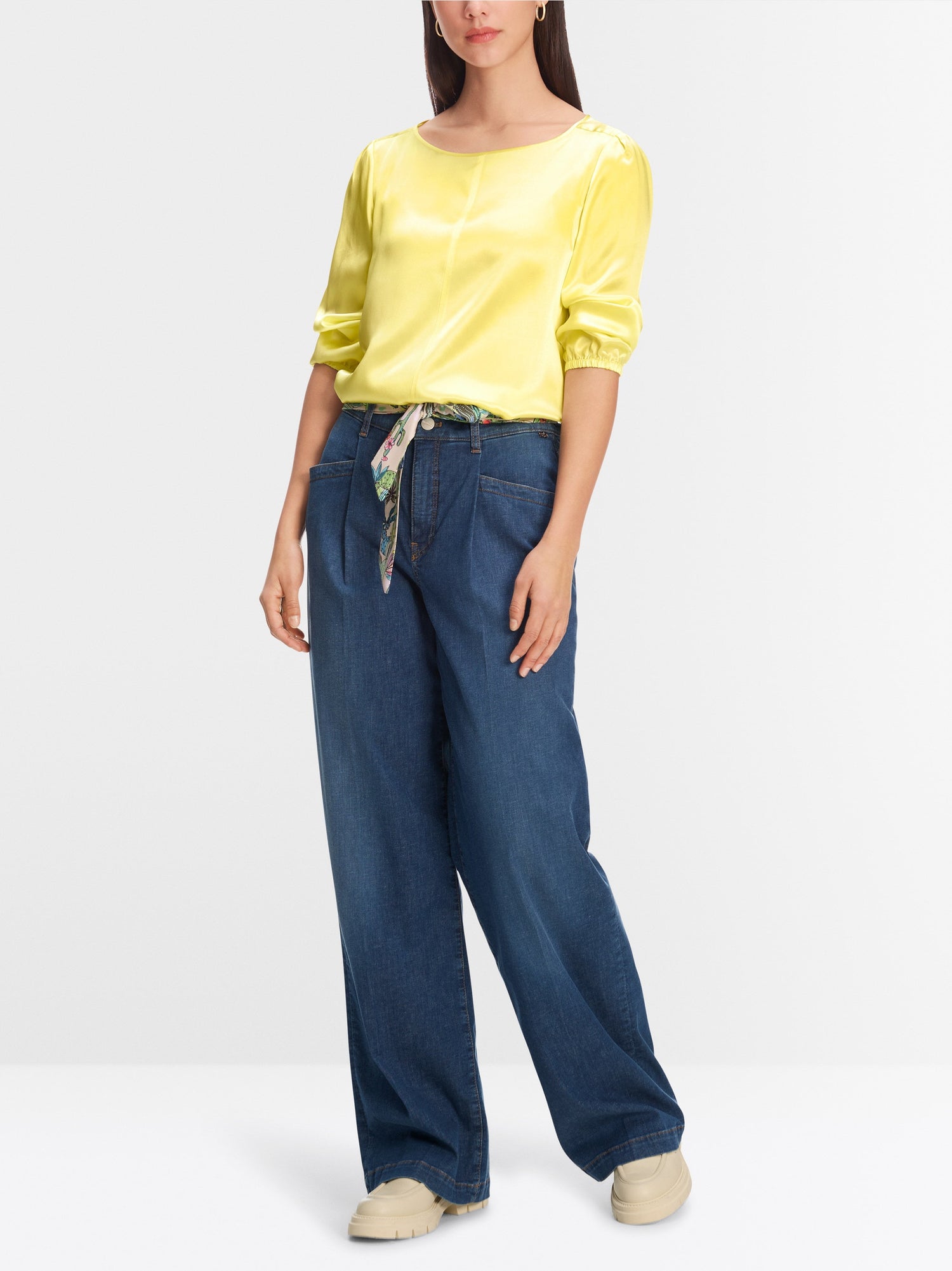 Silk blouse in a minimalist design. The model has an A-line silhouette and narrow shoulders. The eye-catching detail is the sleeve, which starts with a pleat. The neckline is wide and finished with a narrow piping. Elegant and easy to wear.