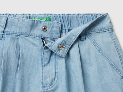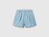 Shorts in pure cotton denim. Inner elastic waist at the back, zip and button opening. Front pockets and patch pockets on the back. Rock'n'roll inspiration with a slightly worn look.