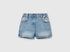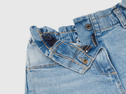 Paperbag style shorts in stretch cotton blend denim. High gathered waist, internal elastic on the back and sides, front opening with zip and button. Logo embroidered on the front pocket. Practical adjustable inner elastic waist. Casual style with a feminine twist.