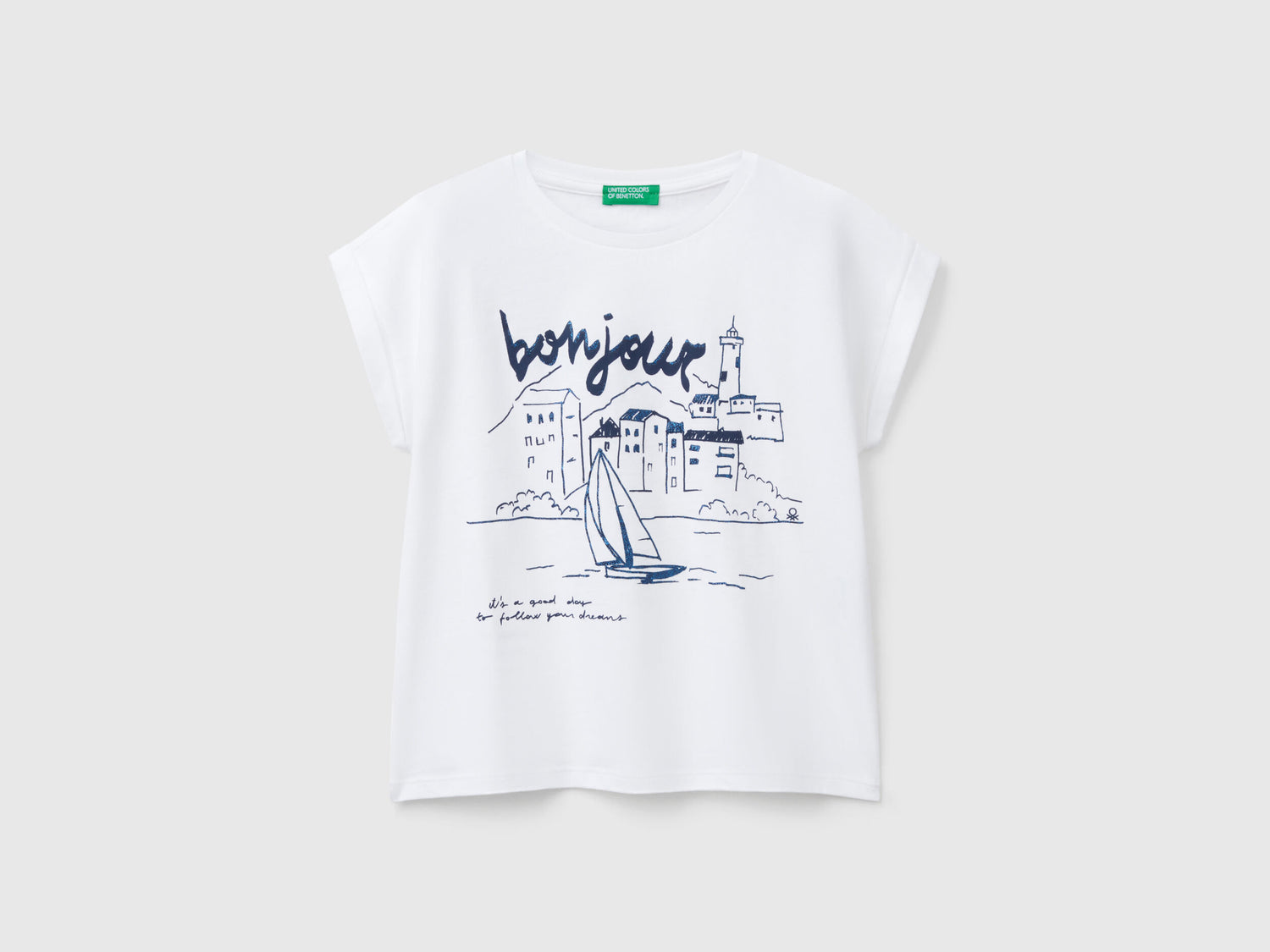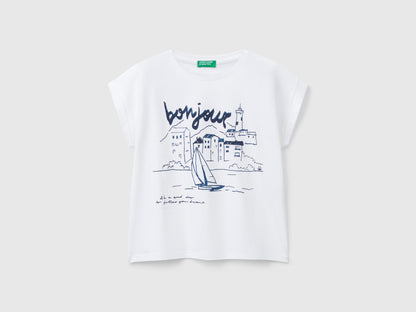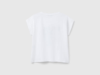 Crew neck boxy fit t-shirt in pure organic cotton. Short sleeves with cuff and whimsical print with glittery details. Comfortable and sparkling. Item made with fabric containing at least 95% organic cotton.