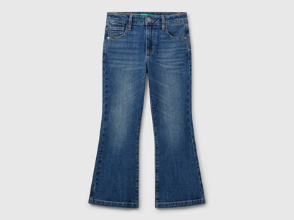 Long five pocket trousers in stretch cotton denim with a worn look. Flared model with flared skirt, waist with convenient zip and button opening. Practical adjustable inner elastic waist. Vintage and feminine style.