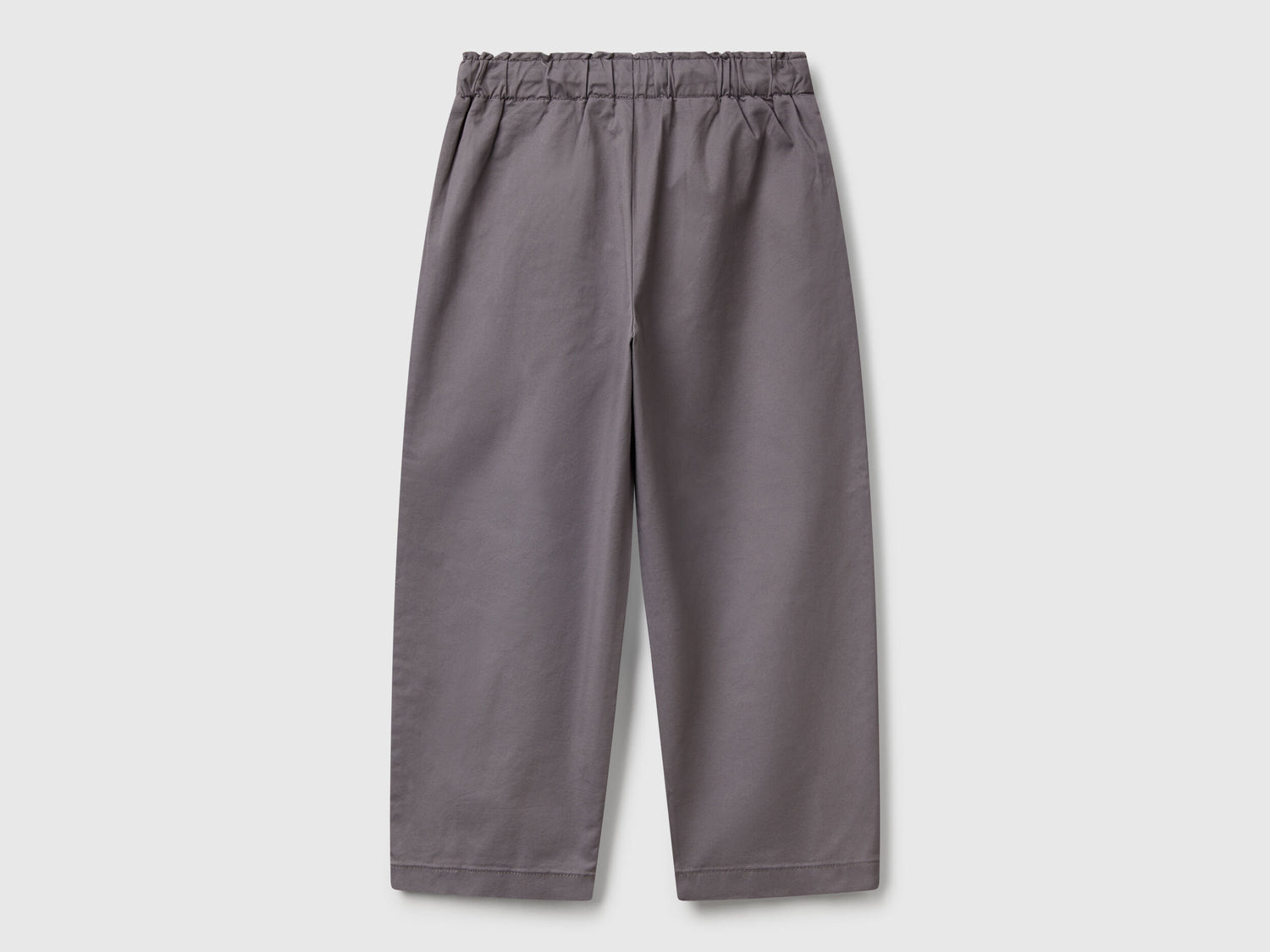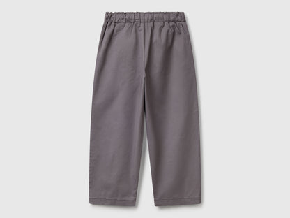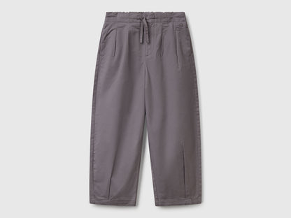 Long trousers in stretch cotton with relaxed leg. Waist with inner elastic at the back, drawstring, hidden zip and button opening. Double pleats on the front and leg bottom. Refined and feminine, for a classic yet bold look.