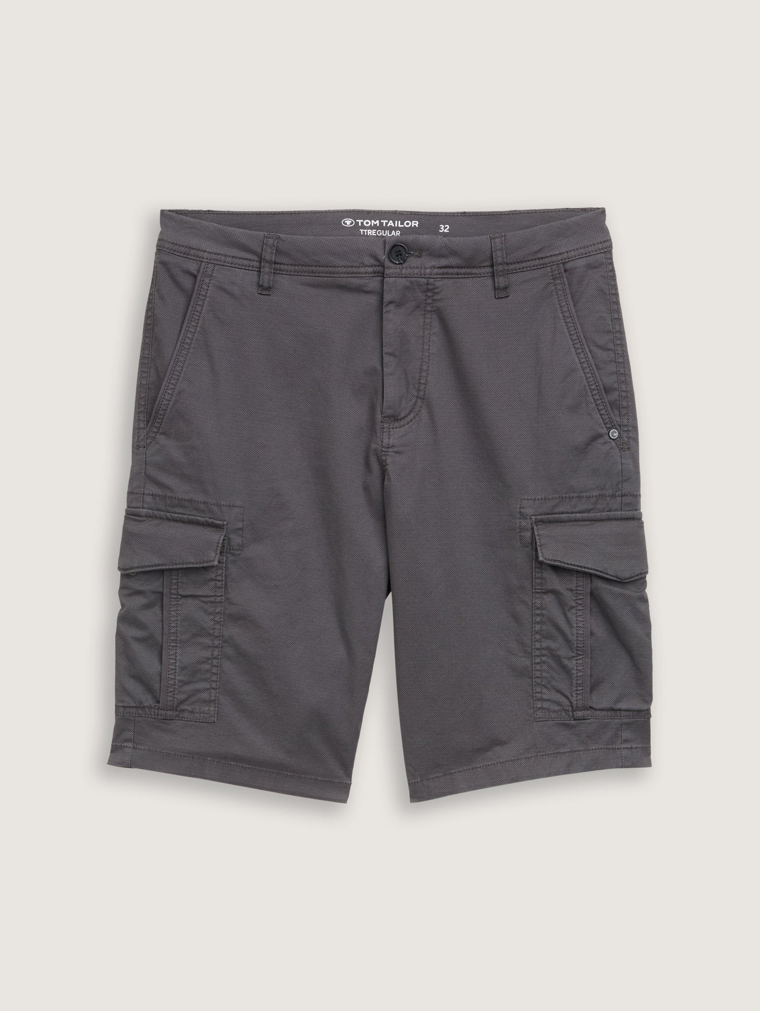 Short cargo trousers with pockets on the leg, side slit pockets at the front and piped pockets at the back. Made from a finely patterned cotton fabric with a slight amount of stretch.
