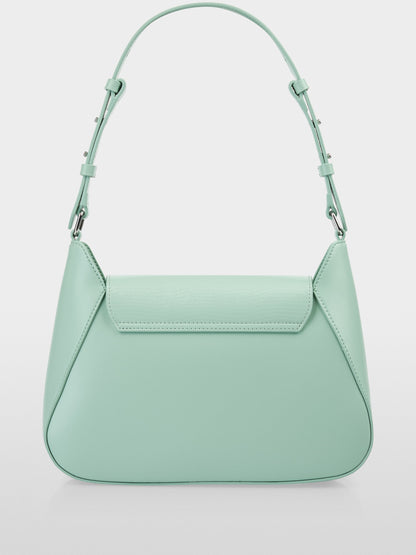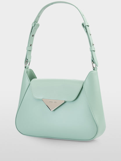 Bag with raised sides that merge into the shoulder strap. The flap is embossed and has a triangular, metal-reinforced closure. Inside: a shiny leopard print lining. A flat inside pocket with a zip helps keep things organized. The length of the shoulder strap is adjustable.
