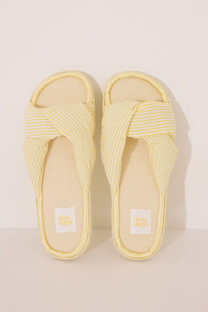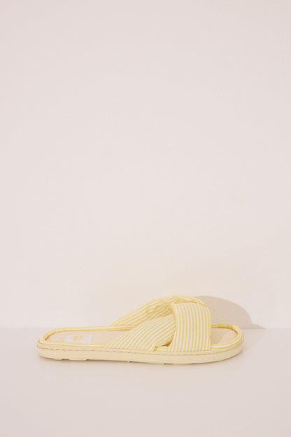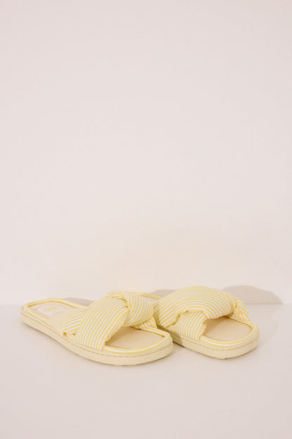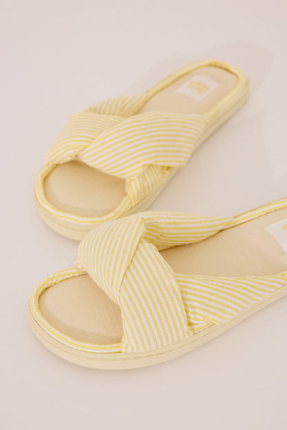 Shower-style slippers made from a light, textured seersucker fabric in yellow. Ideal for wearing around the house or after showering.