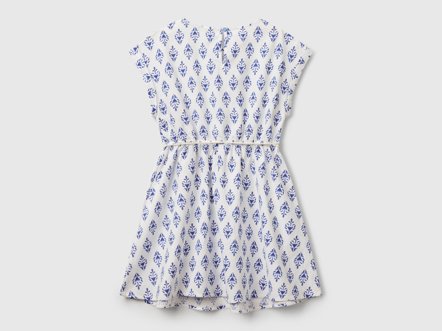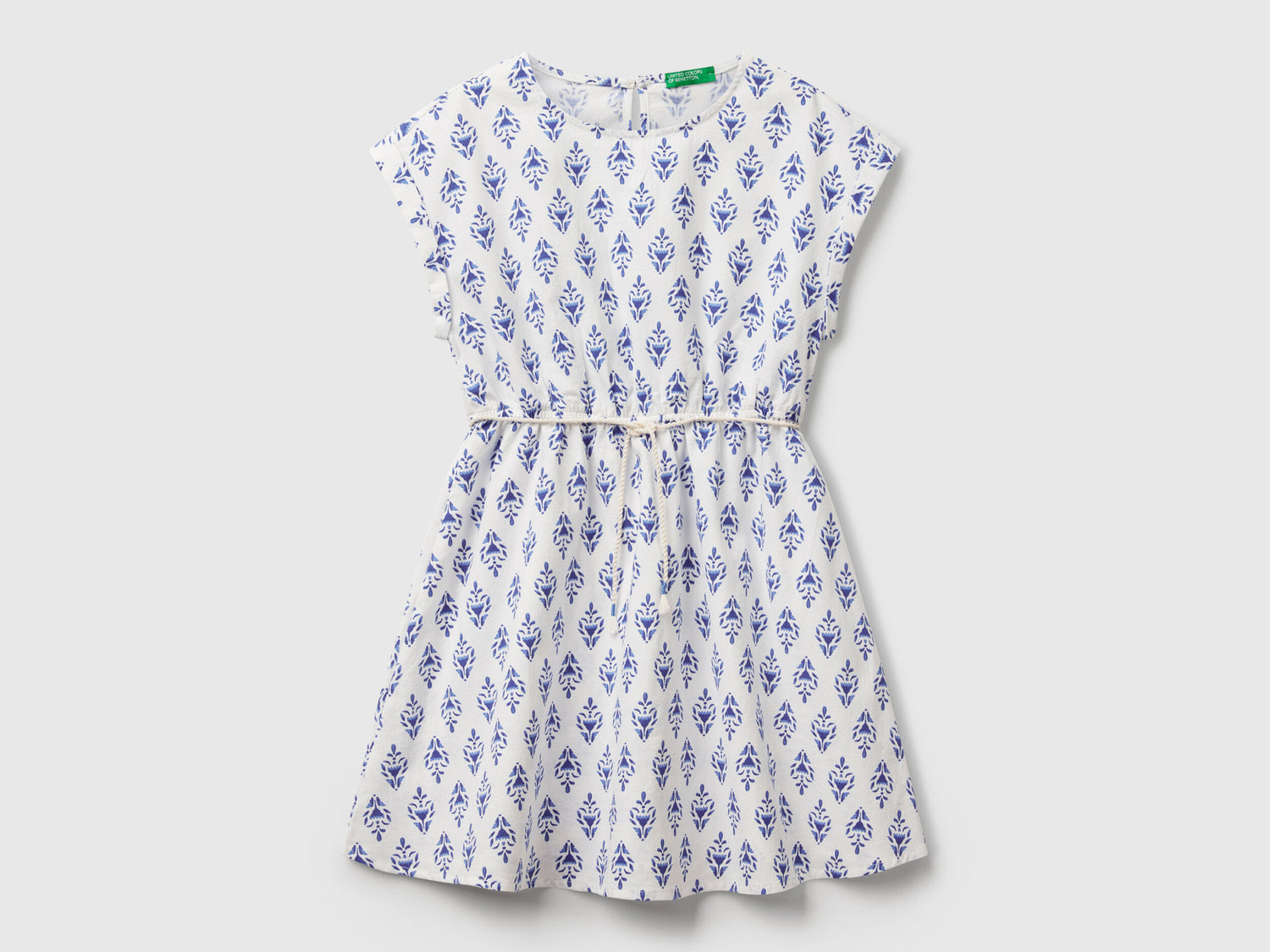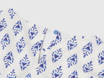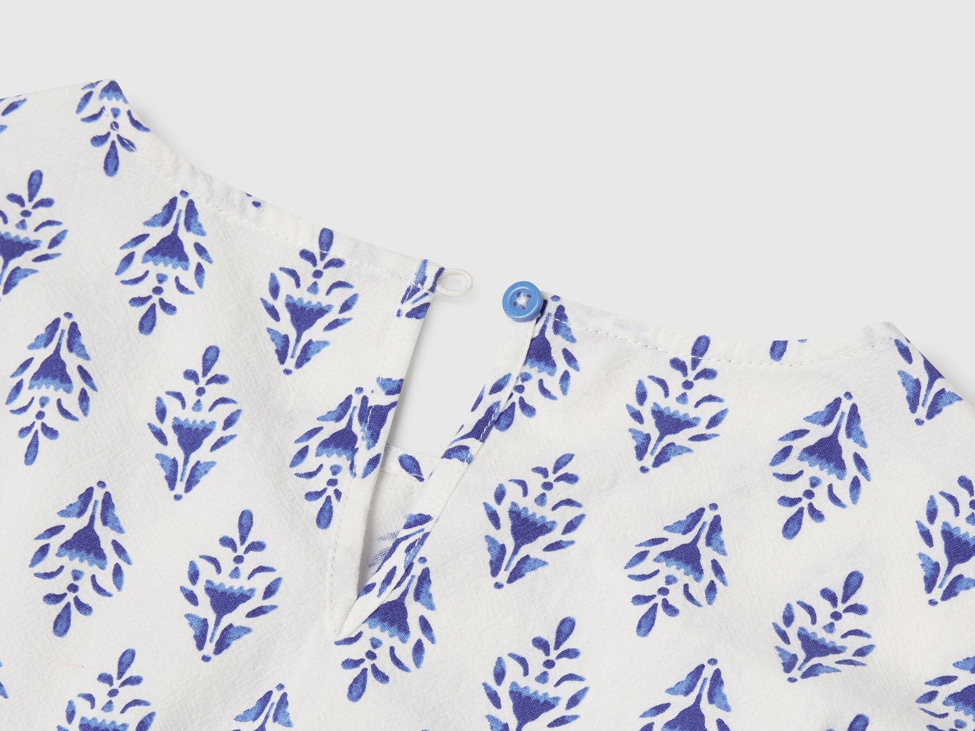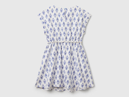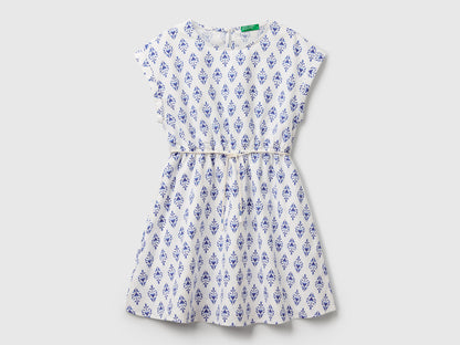 Cute dress in light pure cotton fabric. Round neckline, dropped shoulder with lapel and keyhole opening with button on the back. Hourglass cut with elastic and drawstring waist. Colorful pattern print all over the garment, for a romantic and super feminine look.