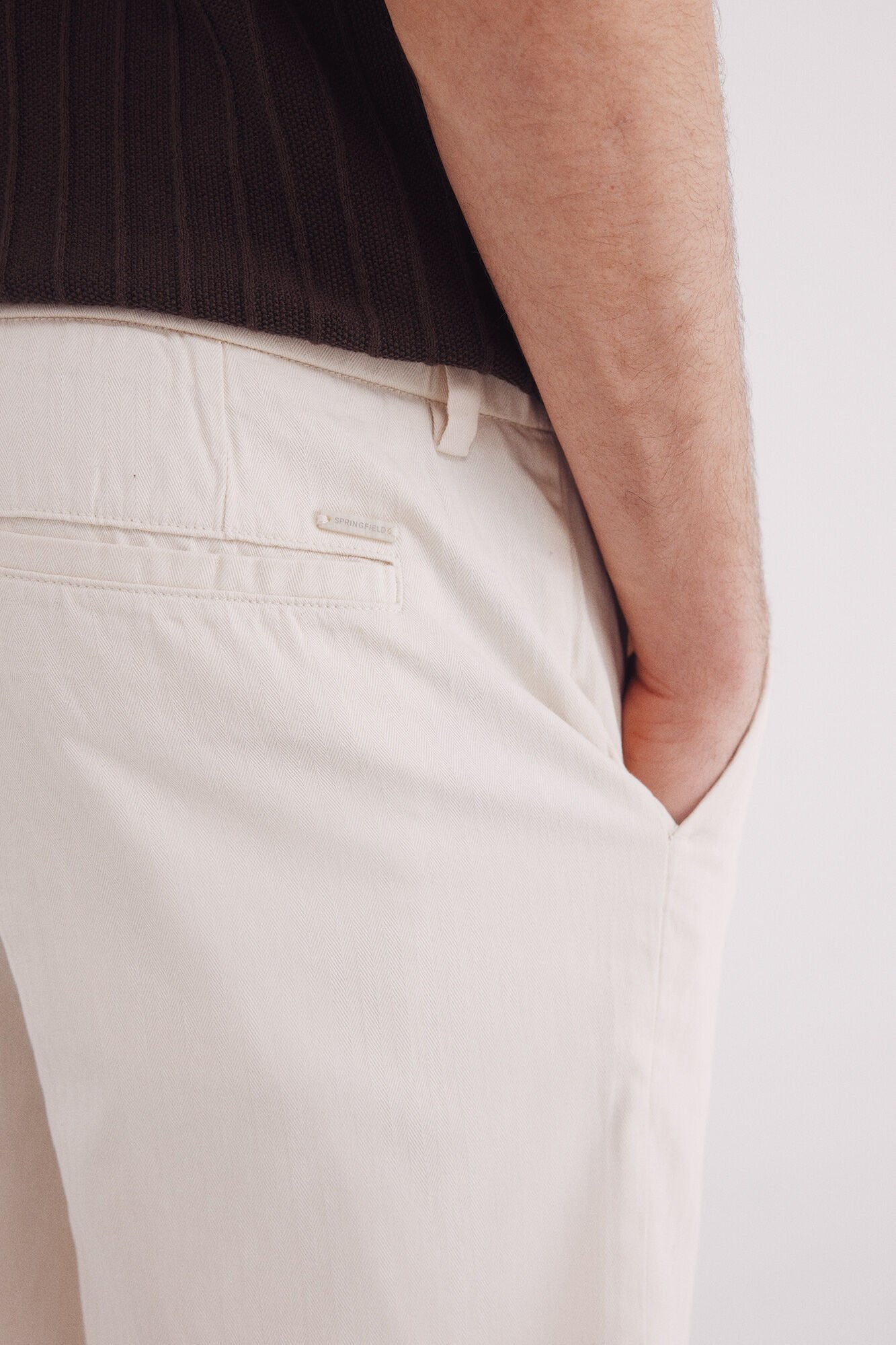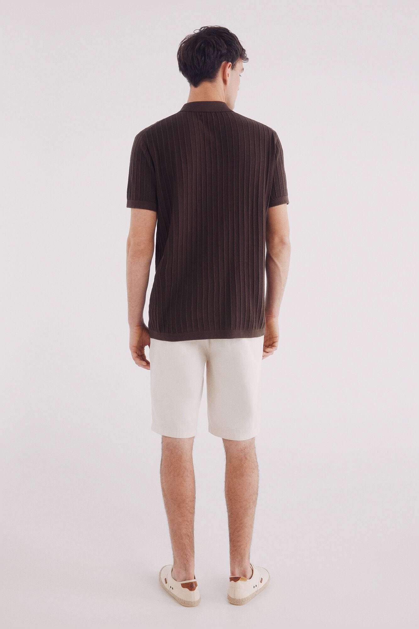 Bermuda shorts in slim fit cotton fabric with herringbone effect. Semi-elastic waistband with internal drawstring for adjustment.