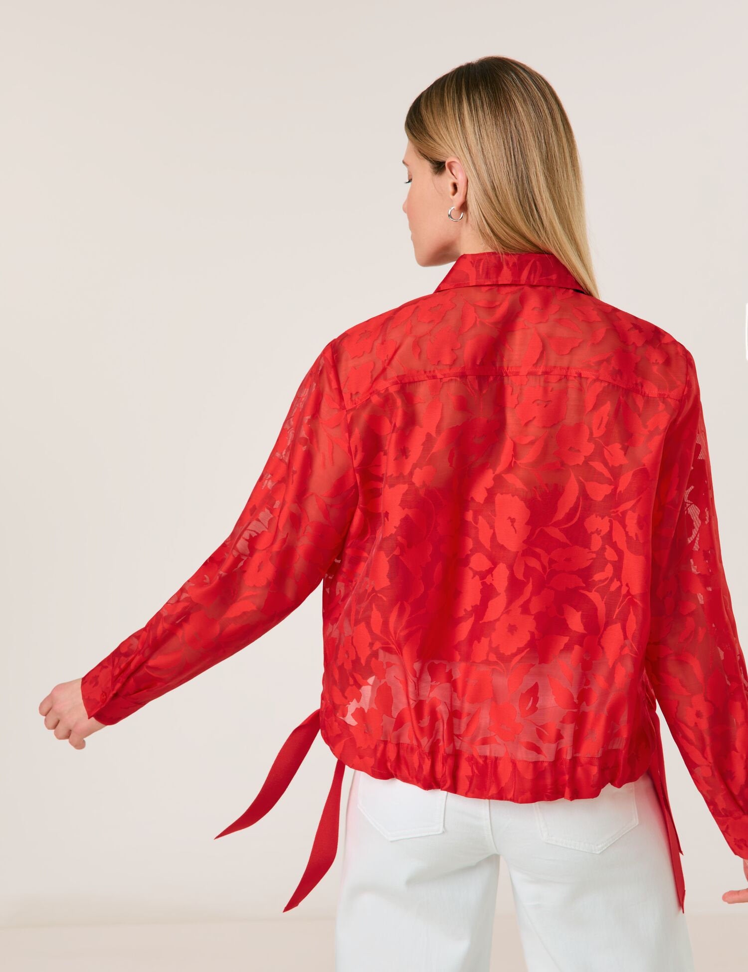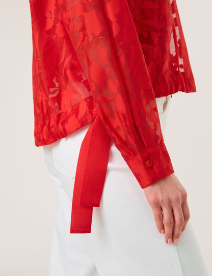 Could there be anything more striking? This fine blouse jacket is a real highlight. The florally patterned fabric with a transparent effect will add a new trendy look to your outfit, while the casual bomber jacket style with side drawstring ties loosely skims the figure. A fashionable trend piece for special occasions and much more!
