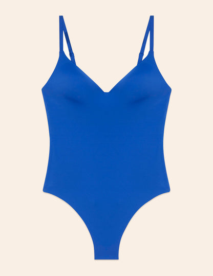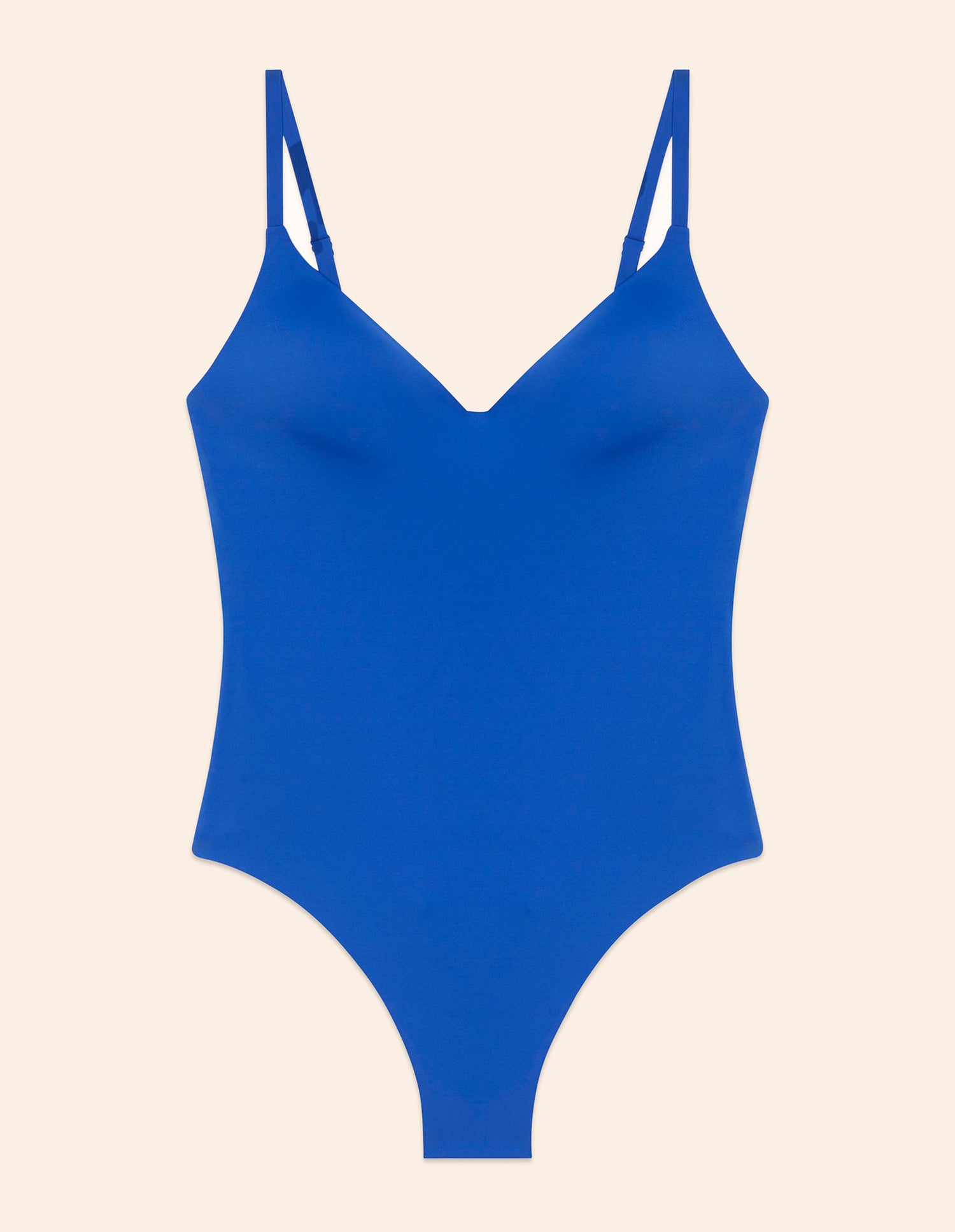 One-piece swimsuit with lightly padded cups and underbust elastic support. Thin adjustable straps, crossable at the back. Deep scoop back and V-neck front. Essentials line, made with Fish Tale fabric from recovered abandoned fishing nets, chlorine-resistant and offering sun protection up to 50+ UPF. Perfect fit, super comfortable, and long-lasting. Available in 2 colors.