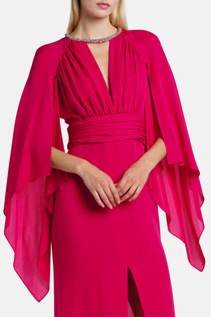 Elegant dress made of pure silk. Features a deep, plunging V-neck, a gathered waist, ample draped sleeved, and a slit in front. Floor-length. Regular fit.