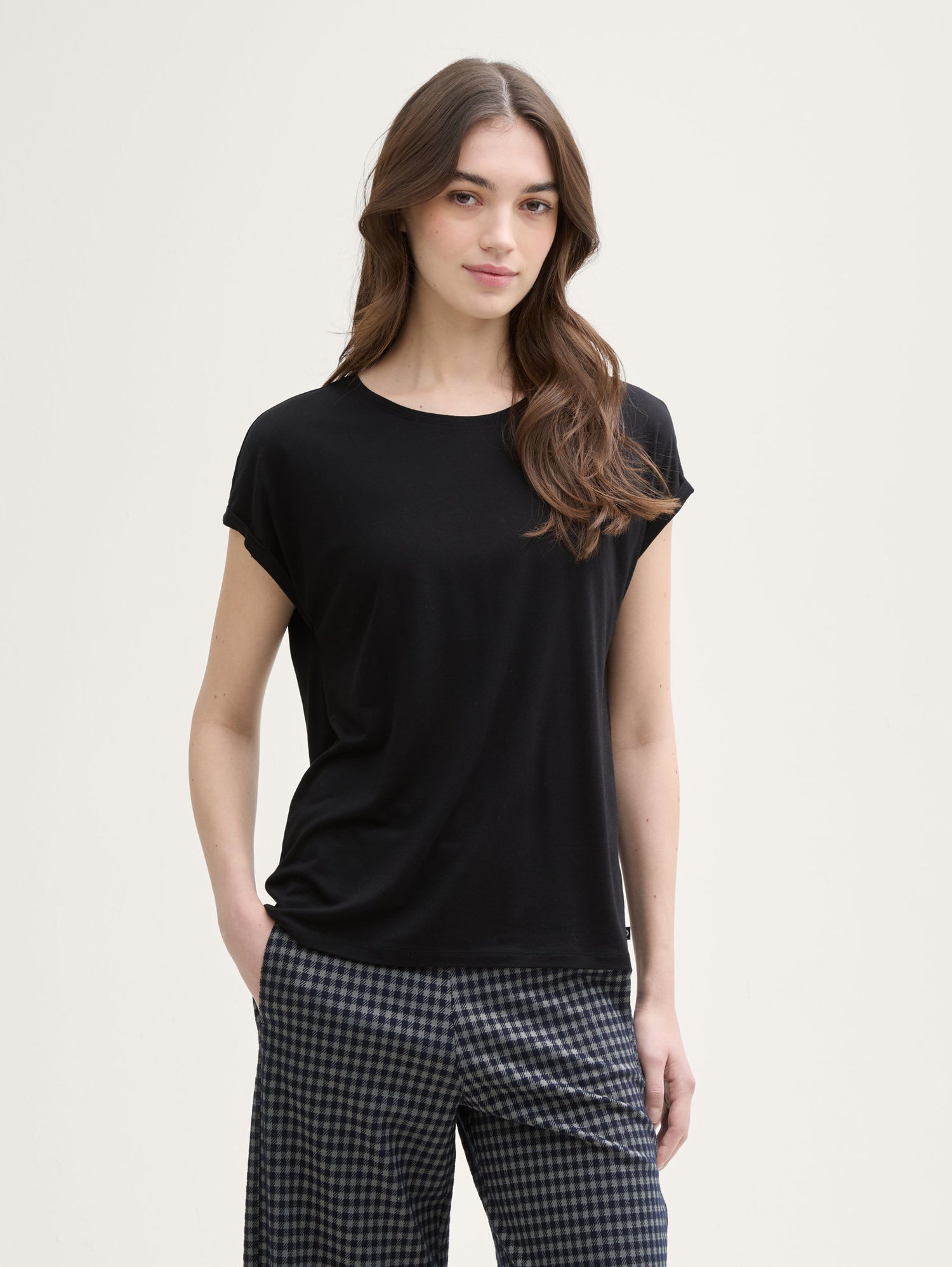 Basic T-shirt in solid colours with slightly dropped shoulder seams. Made from a flowing single jersey fabric.