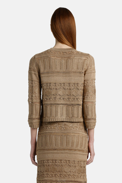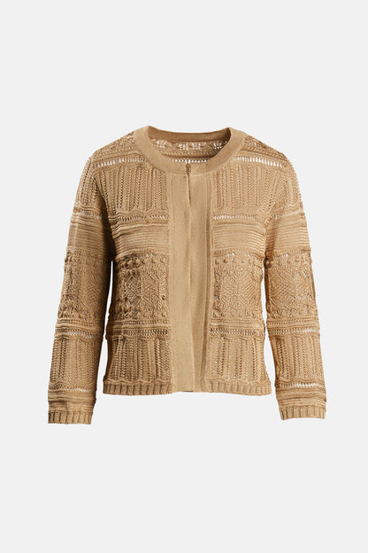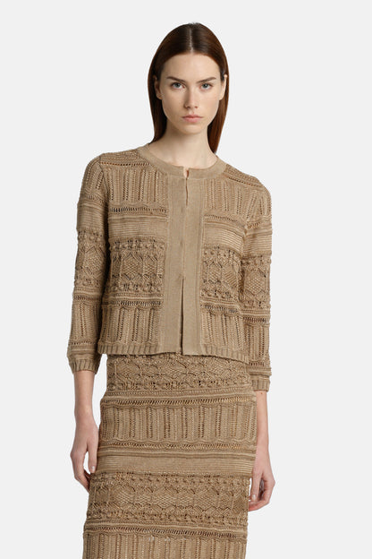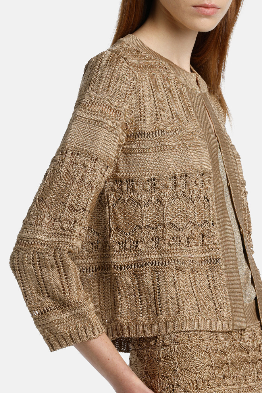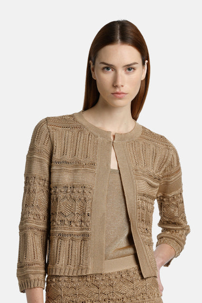 Bon ton cardigan in knit viscose with ribbed ajour details. Features a round neckline, invisible clasp closures.